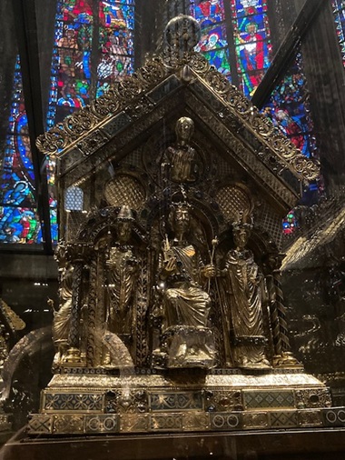 The Charlemagne Shrine, containing his mortal remains, is prominently displayed in the choir area of the church. The oak box is decorated with gilt silver, gilt copper and precious stones.
